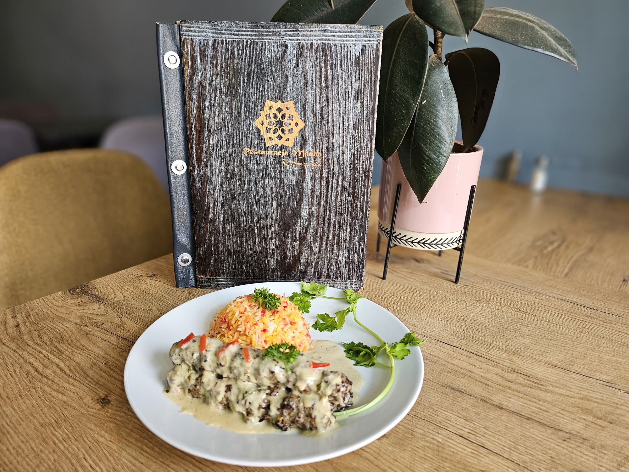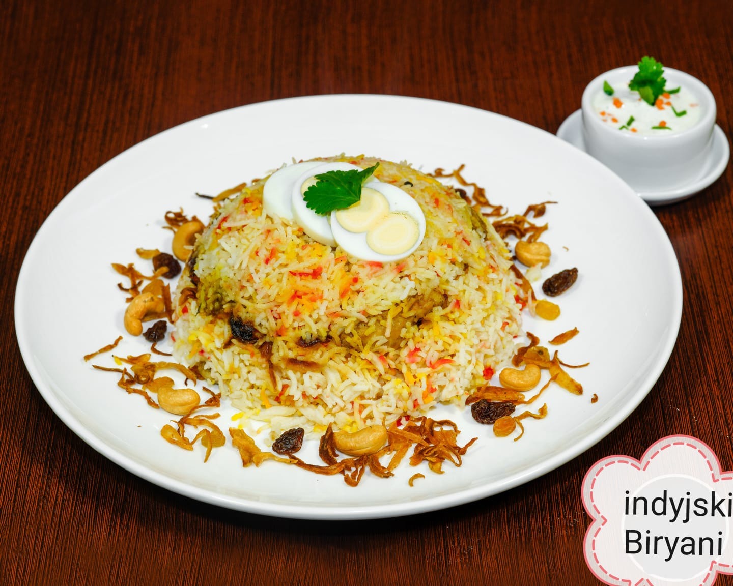 krewetki, ryż basmati, czerwona cebula, czosnek, imbir, indyjskie przyprawy, ghee, rodzynki i orzechy podawana z sosem raita. -