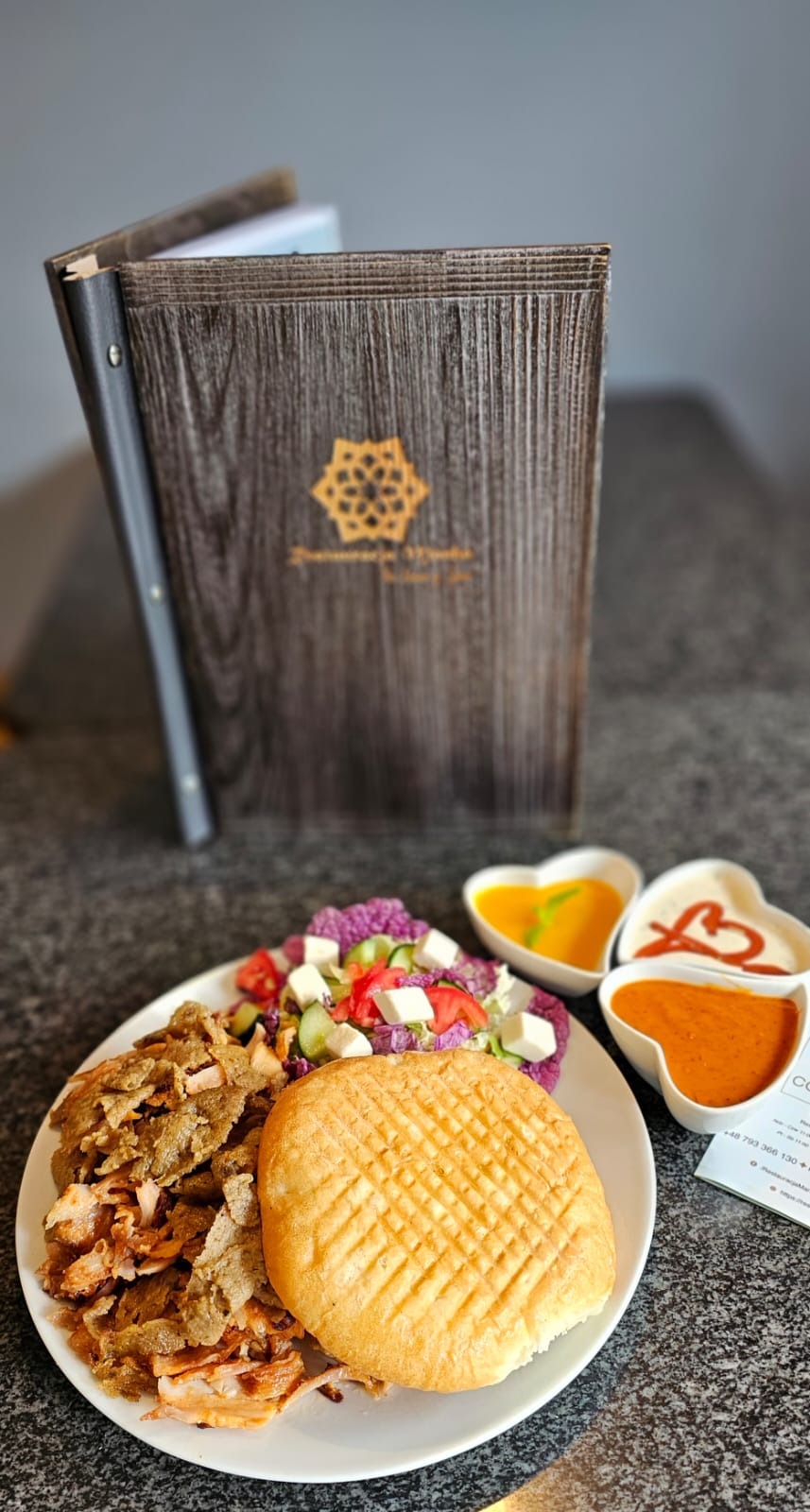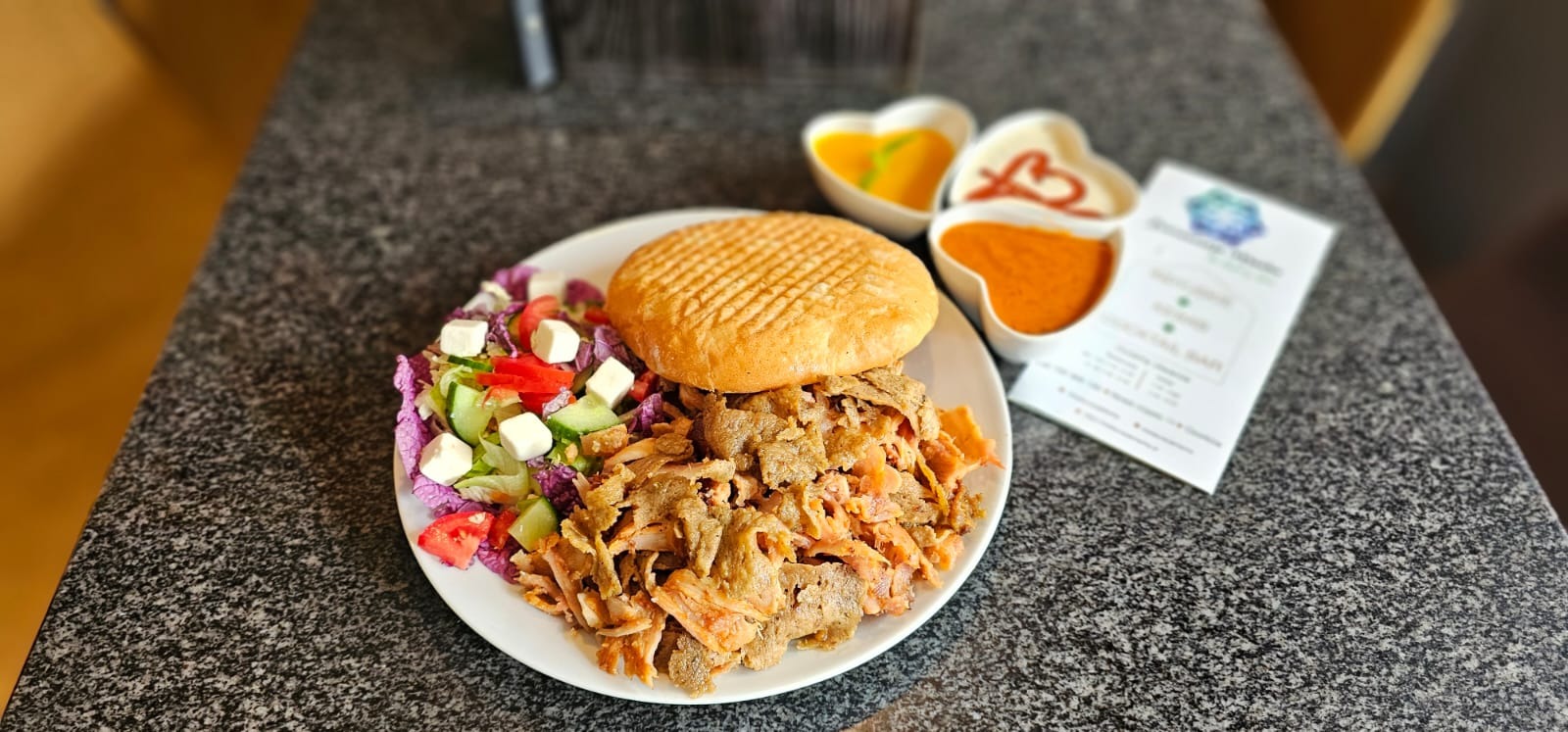 WOŁOWINA Platky, Sałata lodowa, ogórek, pomidor, papryka, ser, sos (sos ziołowy czosnkowy/meksykański ostry/mieszany)