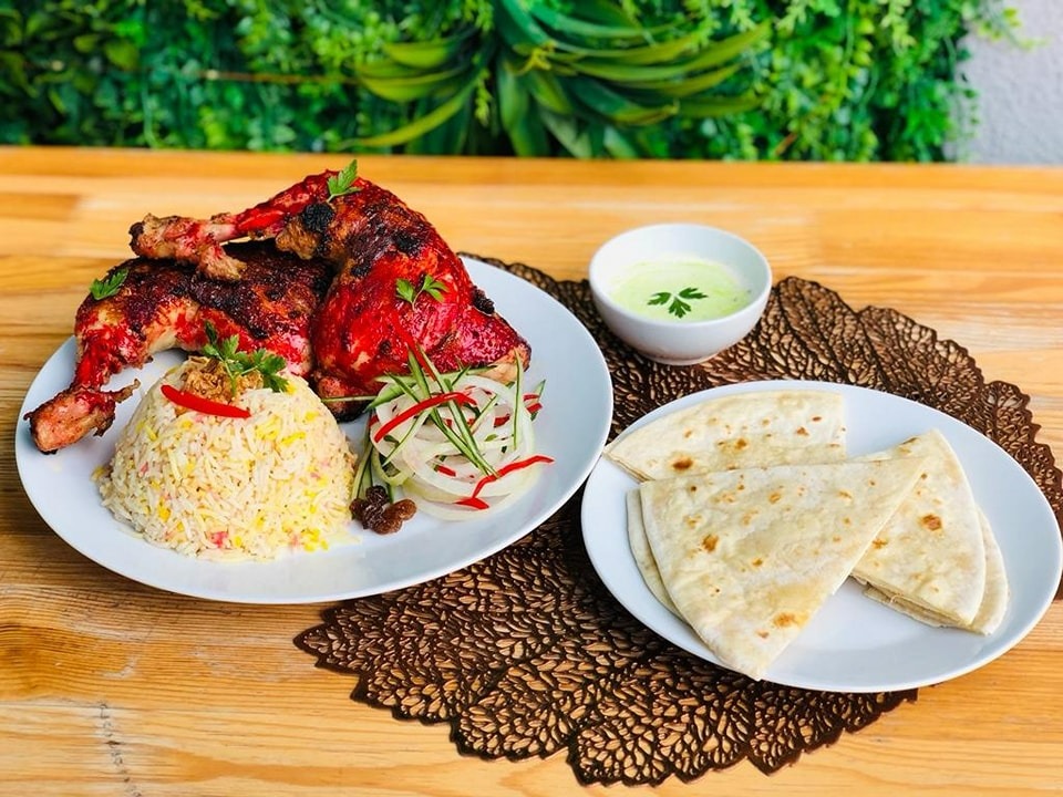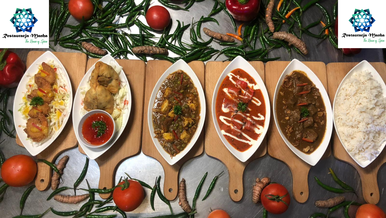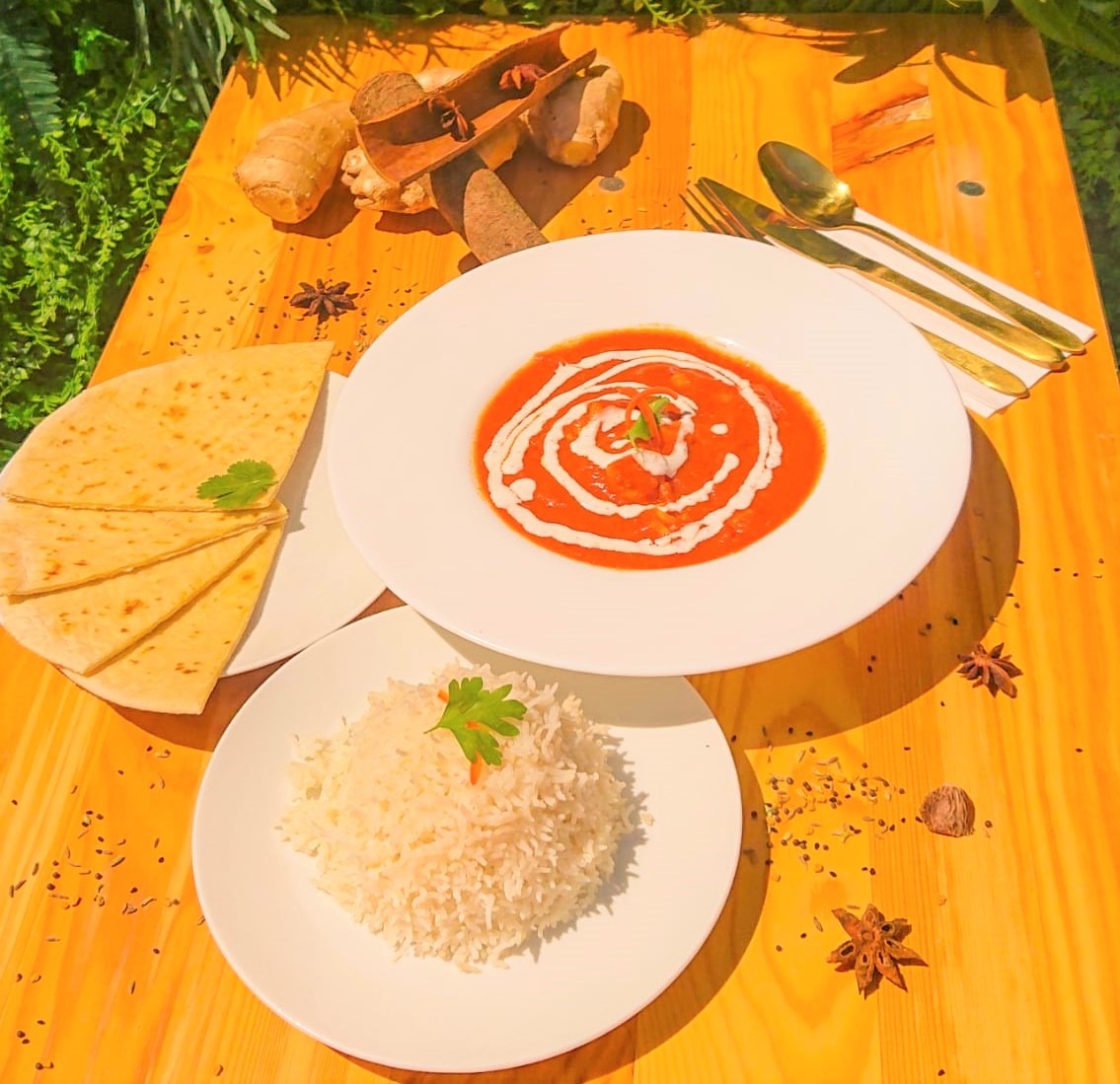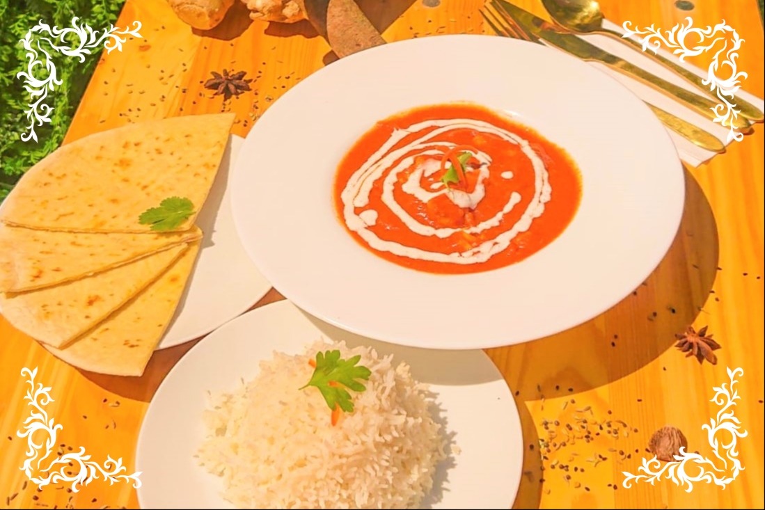 kurczak z tradycyjnym białym sosem korma (cebula, imbir, czosnek, cashewnuts, jogurt, masło, śmietana, ghee) podawany z ryżem lub domowym maślanym roti -