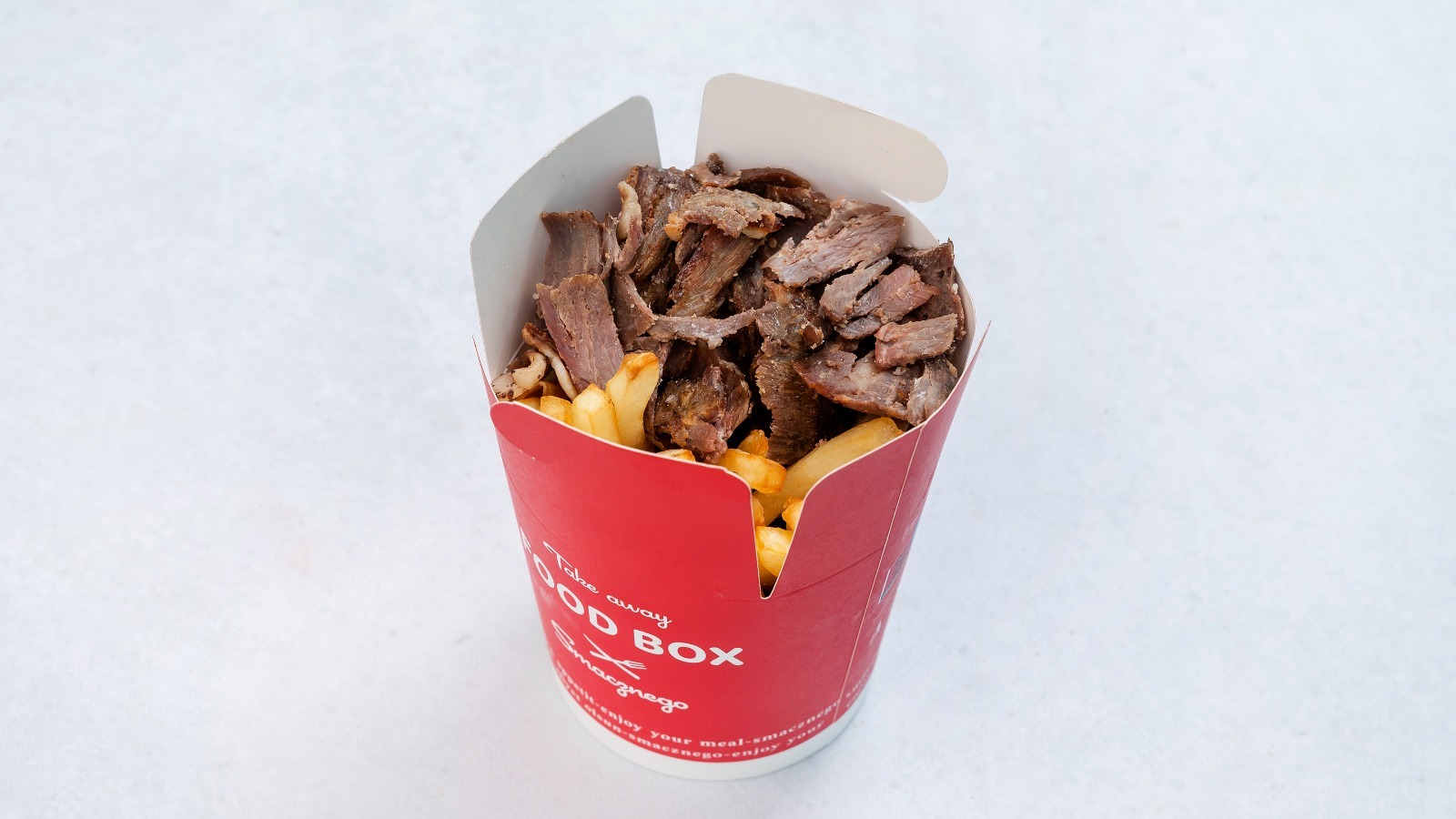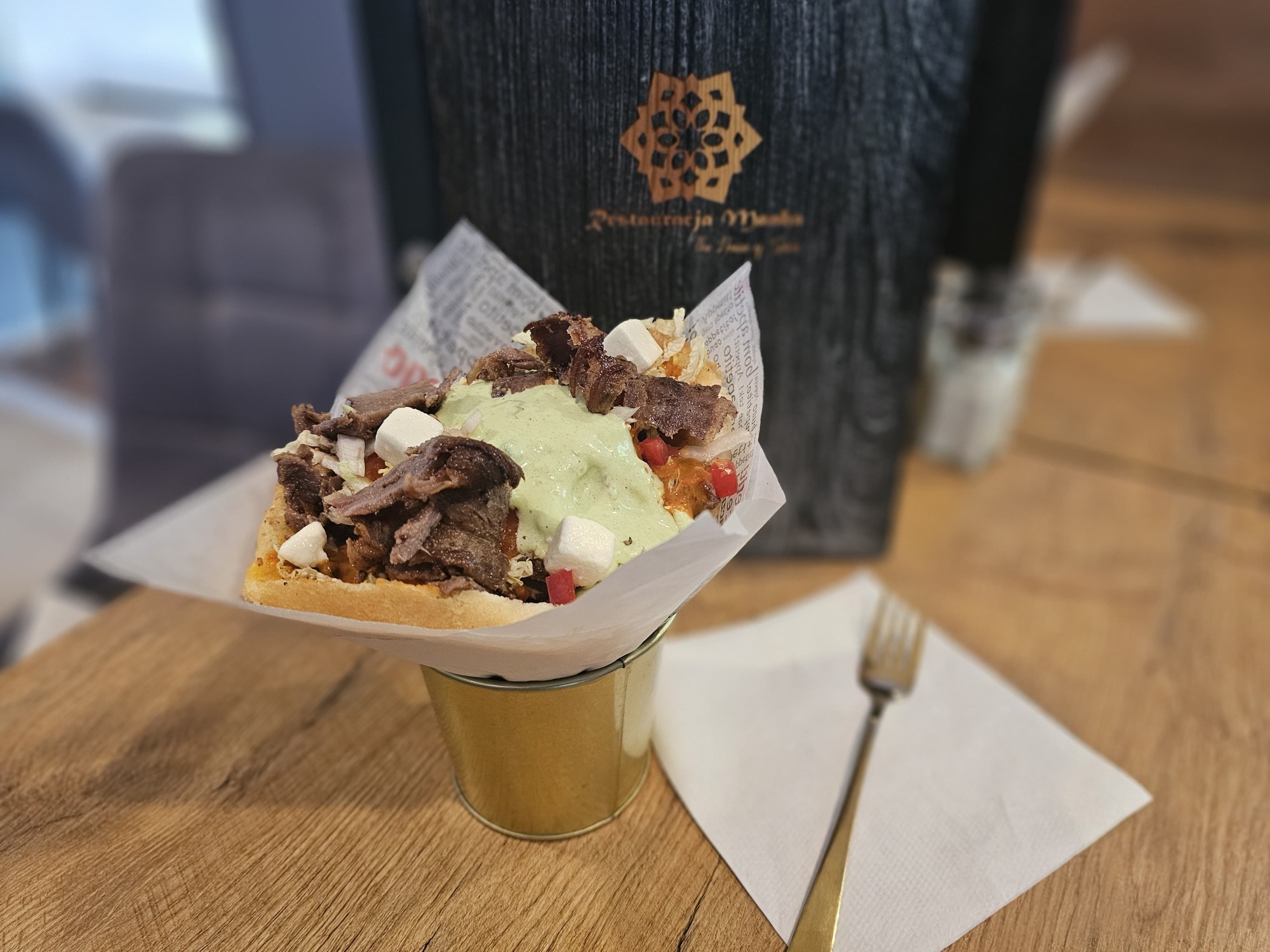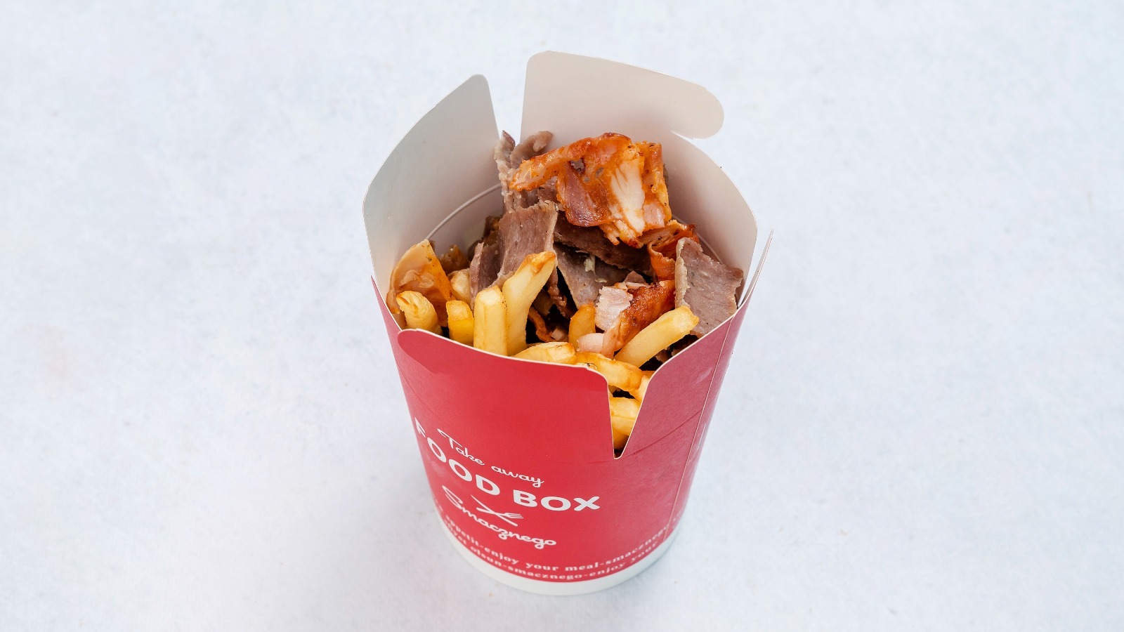 kurczak / wołowina / mieszany, frytki, ser, sos: ziołowy sos czosnkowy / meksykański ostry / mieszany -