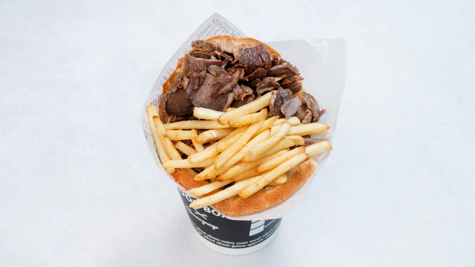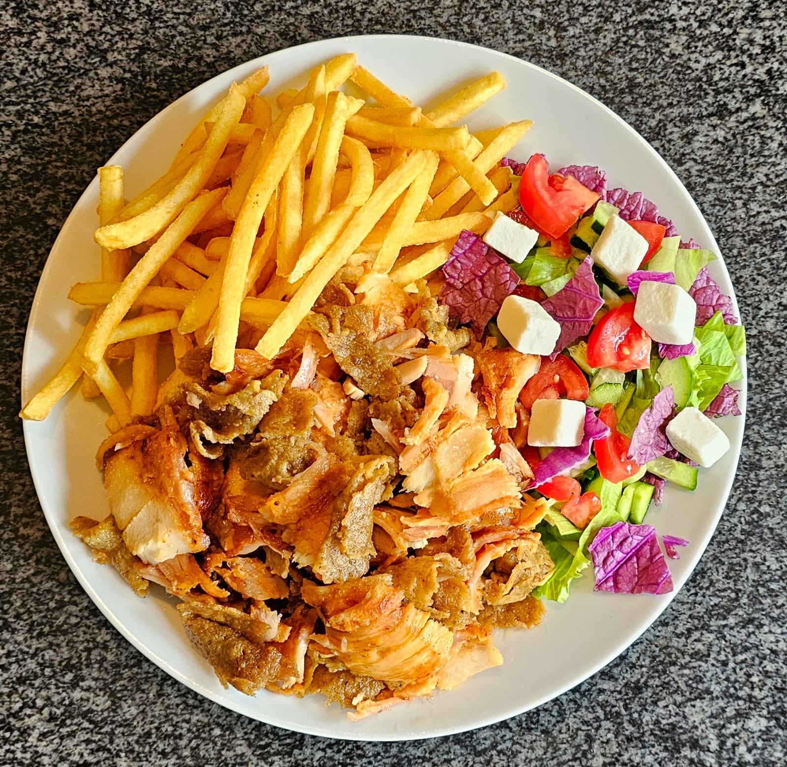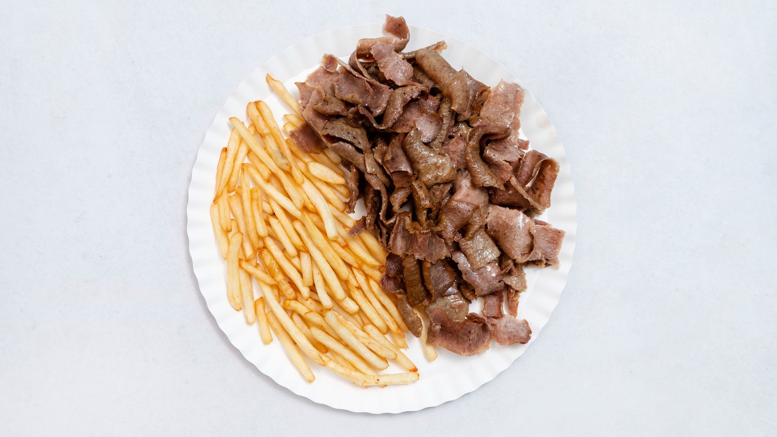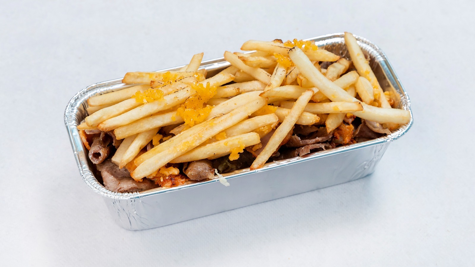 kurczak / wołowina / mieszany, frytki, ser, sos: ziołowy sos czosnkowy / meksykański ostry / mieszany -