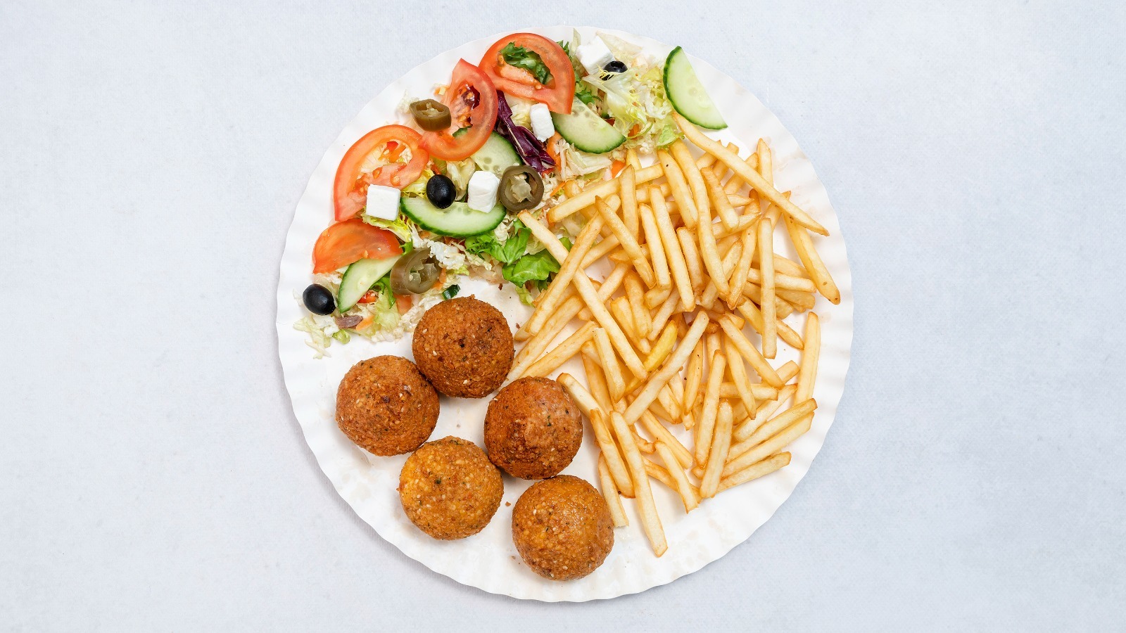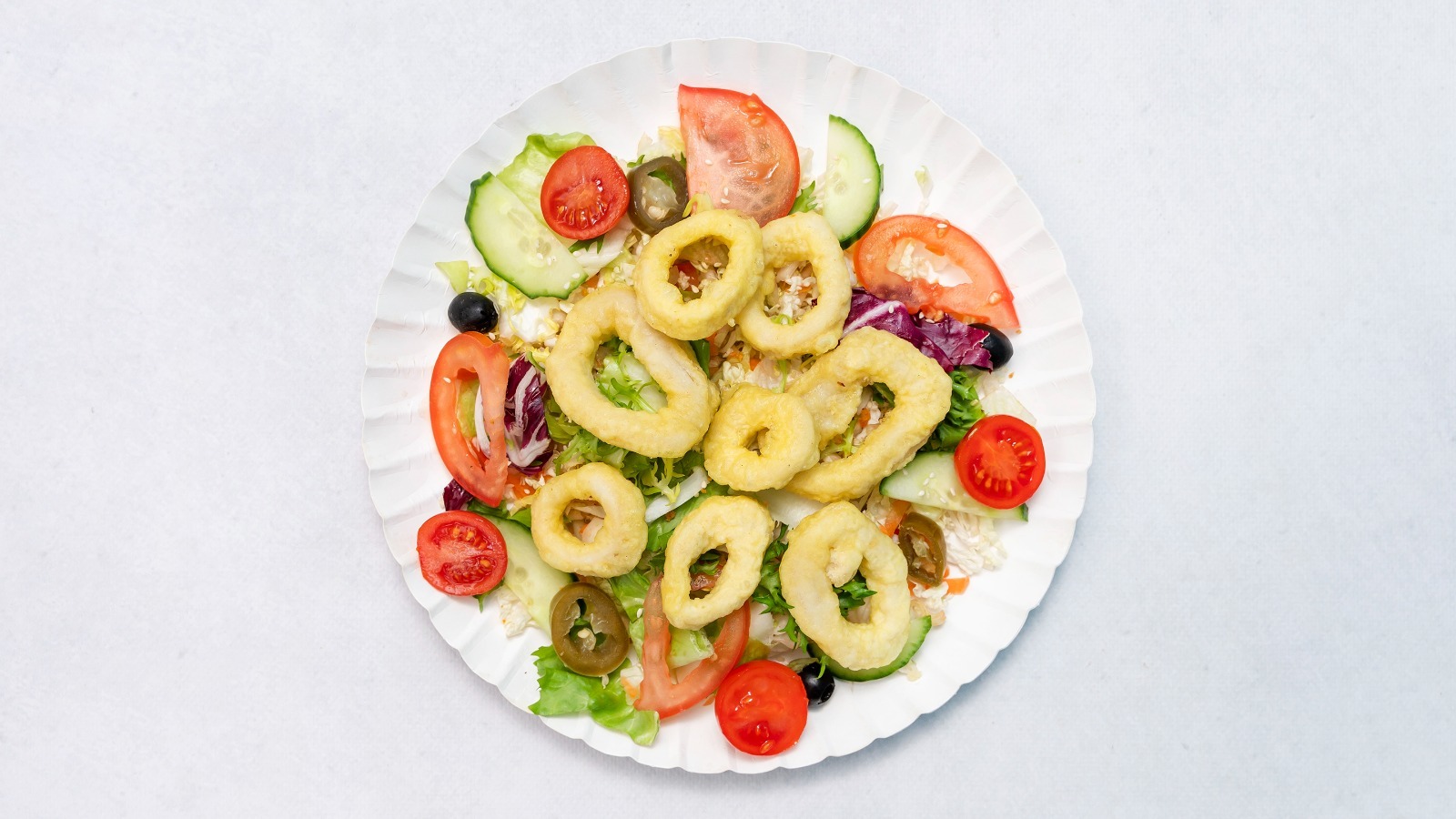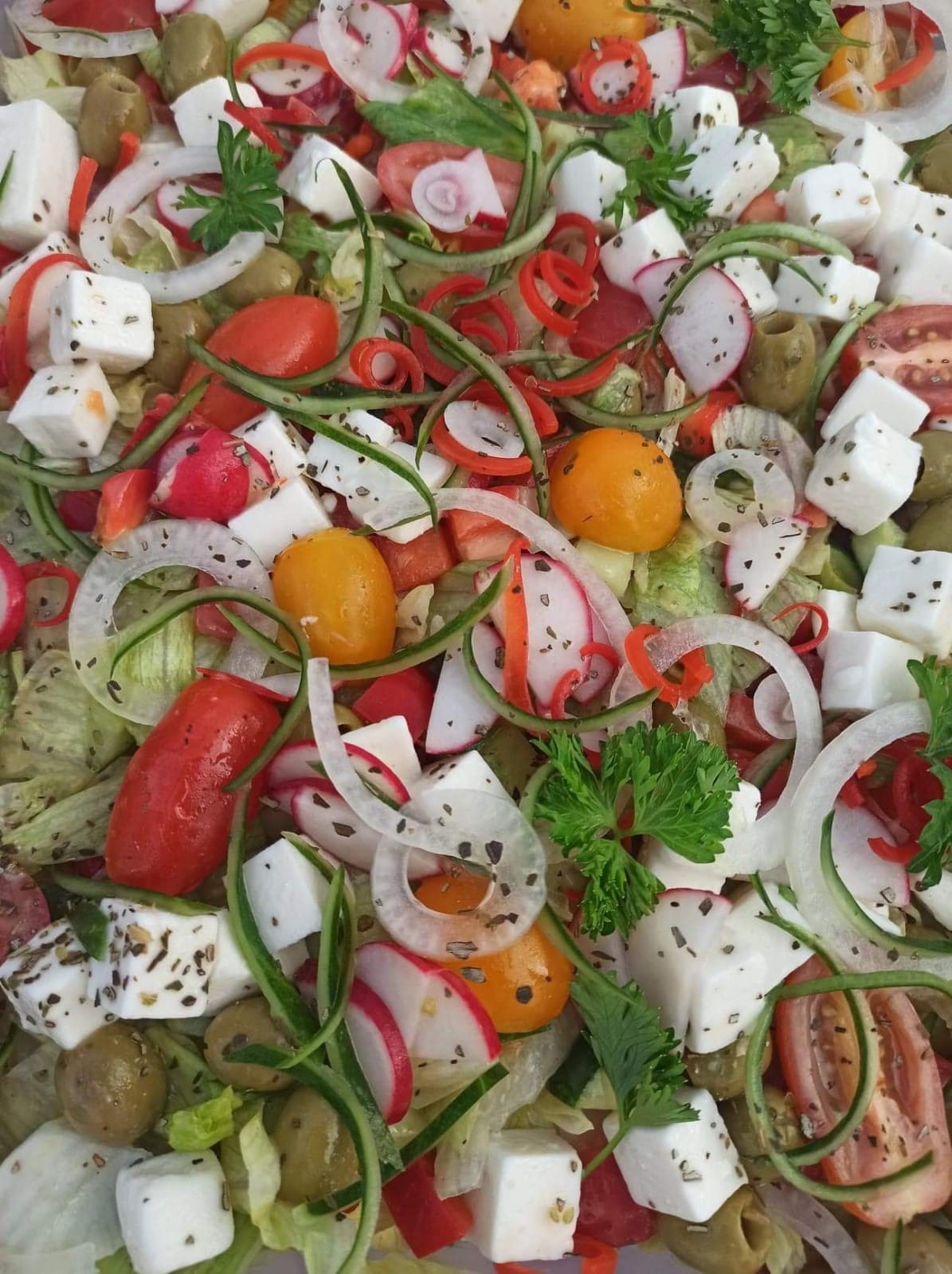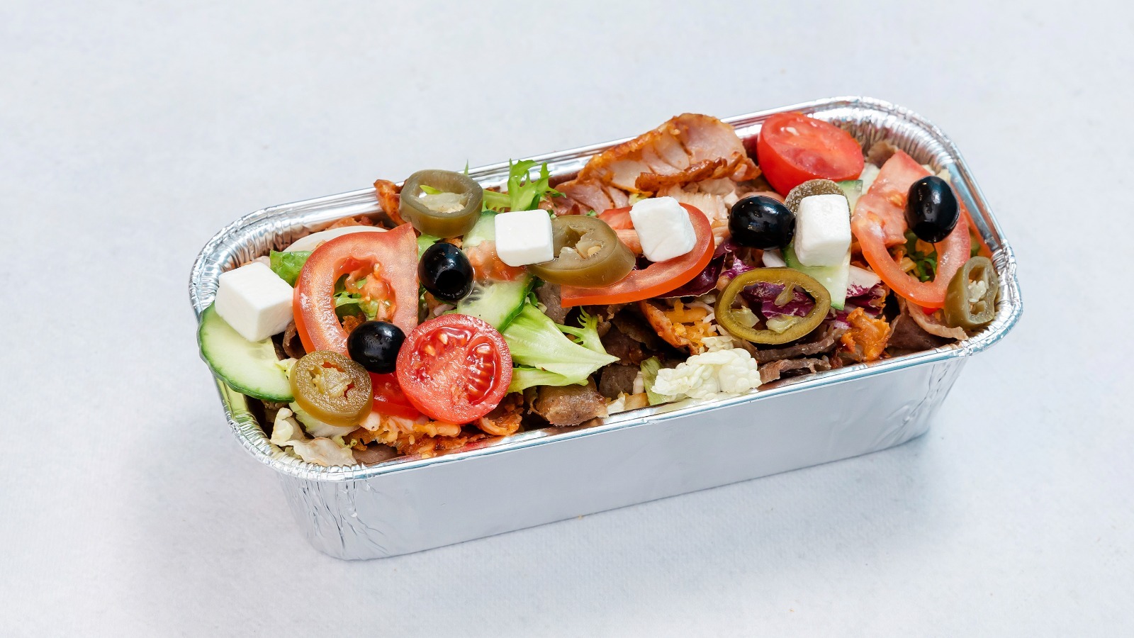 Sałata lodowa, ogórek, pomidor, papryka, ser, sos (sos ziołowy czosnkowy/meksykański ostry/mieszany lub sos łagodny mango/ostry mango/mieszany mango)