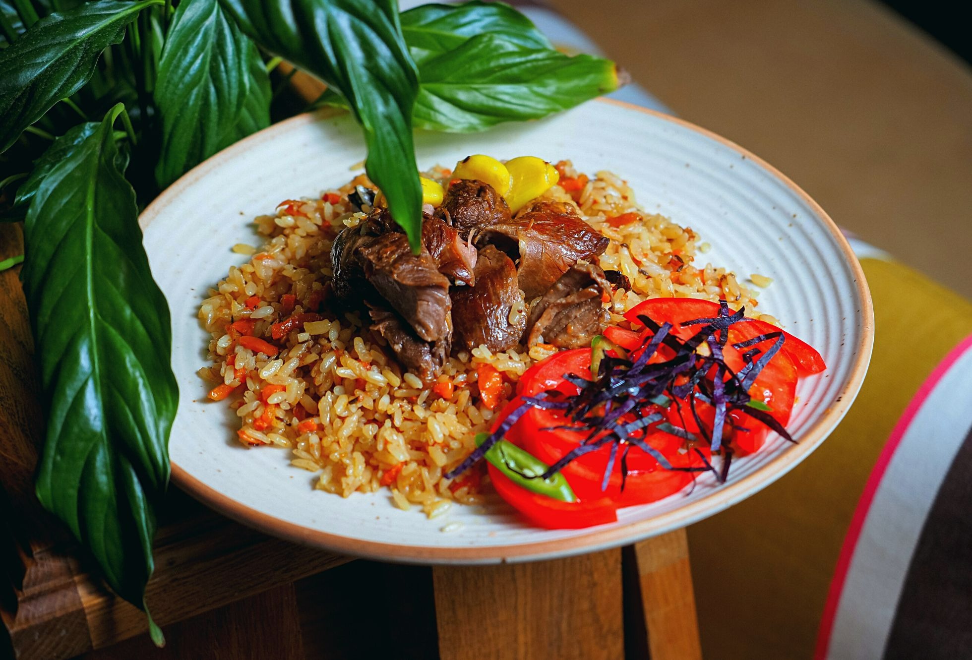 Wołowina w średnio pikantnej masali z cebulą i papryką podawana z ryżem basmati lub domowym maślanym Roti -