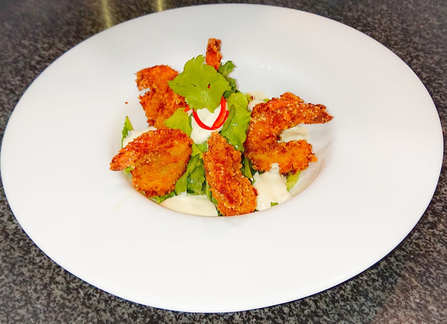 (smażone Krewetki, mix Sałat podawanych z dressingiem wasabi z mango)