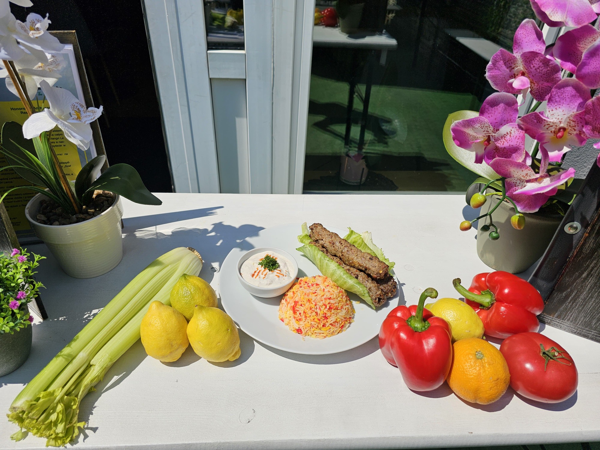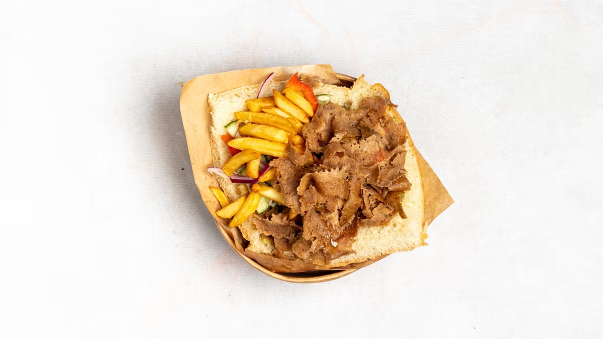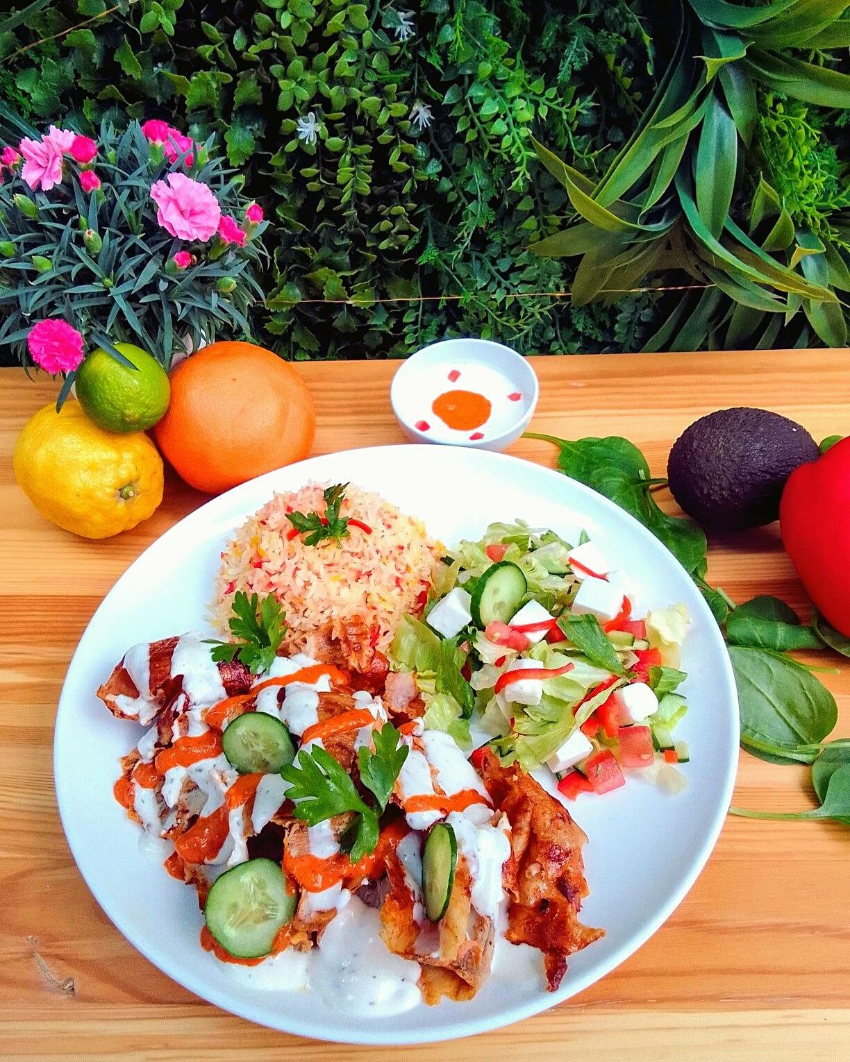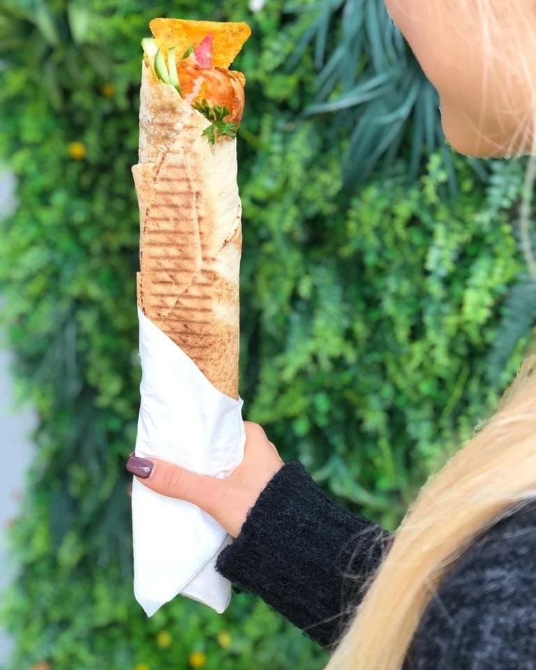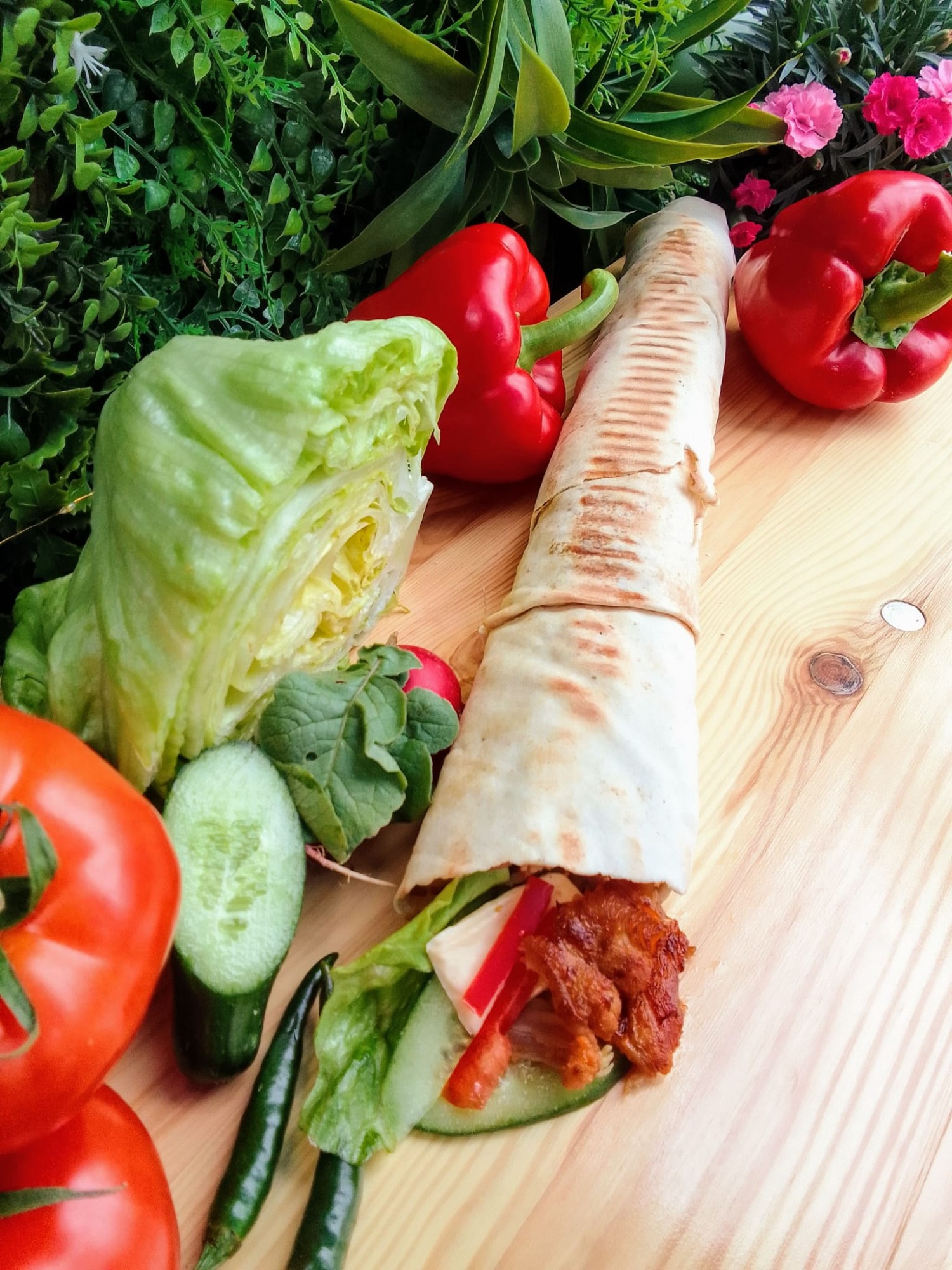 chicken/beef/mix meat, Iceberg lettuce, cucumber, tomato, paprika, cheese, sauce (special very spicy sauce!)